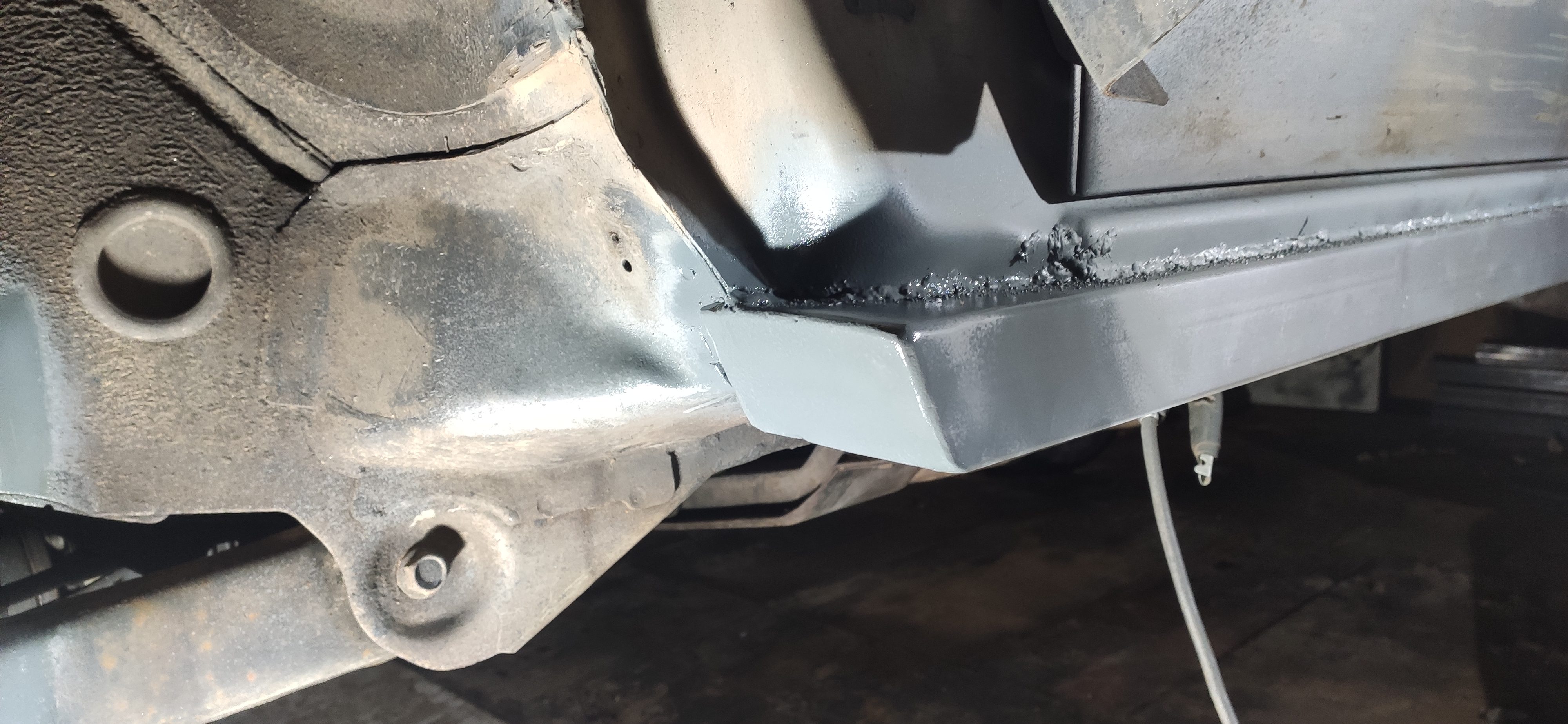 ega seal karbi taga ka midagi ilusat vastu ei vaata. tehase rock railid on kenad, aga minu hinnangul koguvad ebavajalikku solki üsna korrosioonitundlikesse kohtadesse. Omal oli väljastpoolt kõik väga kena, pindmise roostega oleks hakkama saanud aga sisemine karbikülg, mis ülevalt keresse läheb, oli ikka suuri auke täis. Tagumise raami-karbi tugevdussilla alt ja selle tagant koopani andis ka üsna palju taastada. Läks asemele 60x120x4mm toru. igasugused nurgatagused likvideerisin ära, kui põllu peal rehv muda loobib, siis ei jää kuhugi kinni väga enam. Siin tuleb keevitajaga arusaamisele jõuda, kas tasub mässata originaali välimusega ja fabritseerida juppe või tõmmata ukseserva alt julmalt plekk maha, rooste vastu töödelda ja midagi robustsemat asemele ehitada.